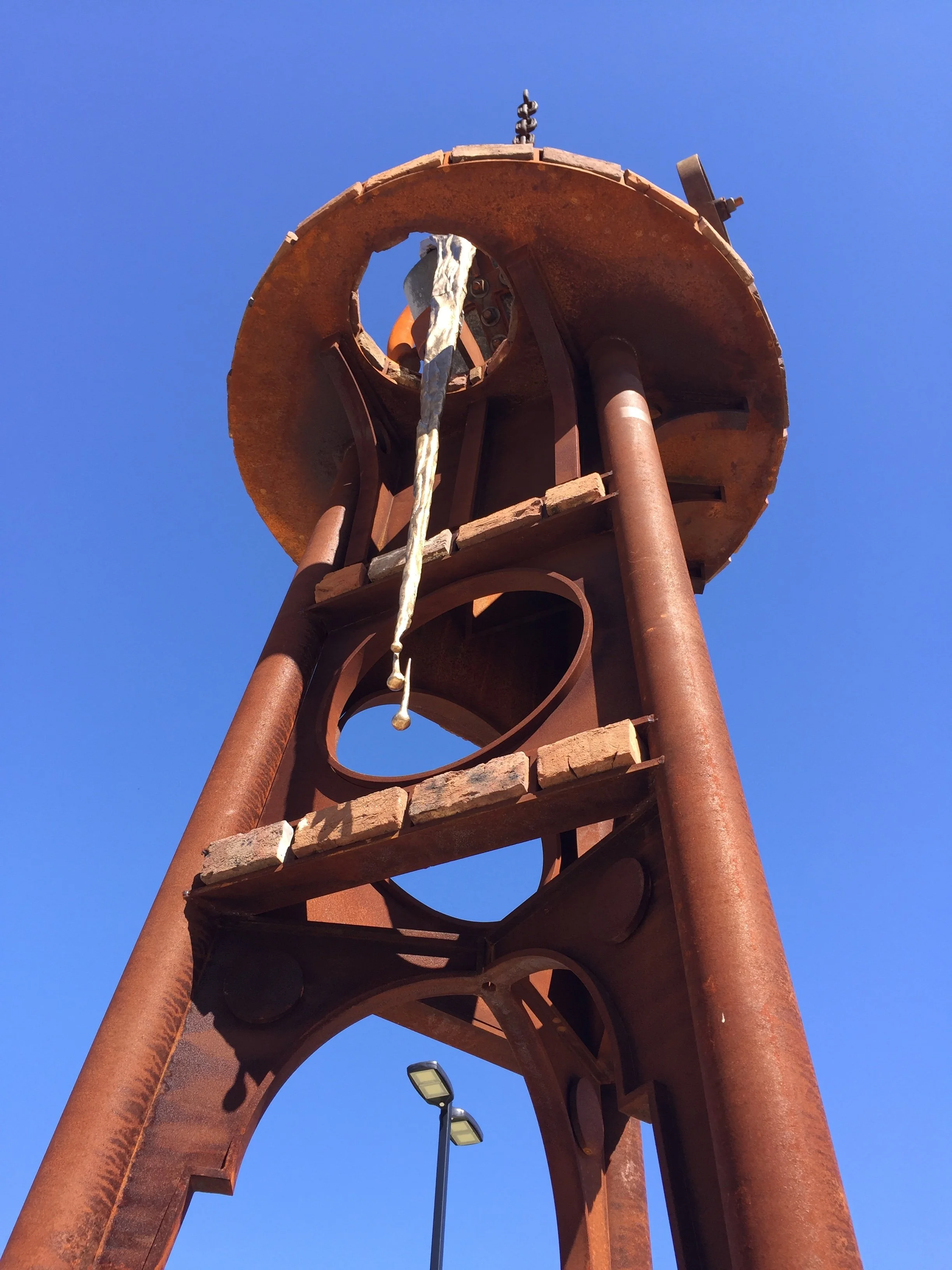 Materials: Cor-Ten steel, cast bronze, silicon carbide crucible, vintage mill stone found on the construction site, vintage furnace bricks from a near by foundry.